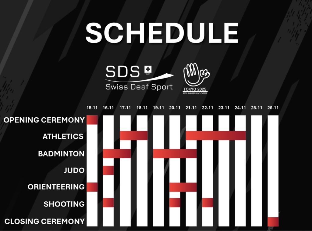 Verfolgen Sie das spannende Wettkampfprogramm der Deaflympics 2025 in Tokyo – mit allen Terminen und Highlights unserer Schweizer Athletinnen und Athleten.