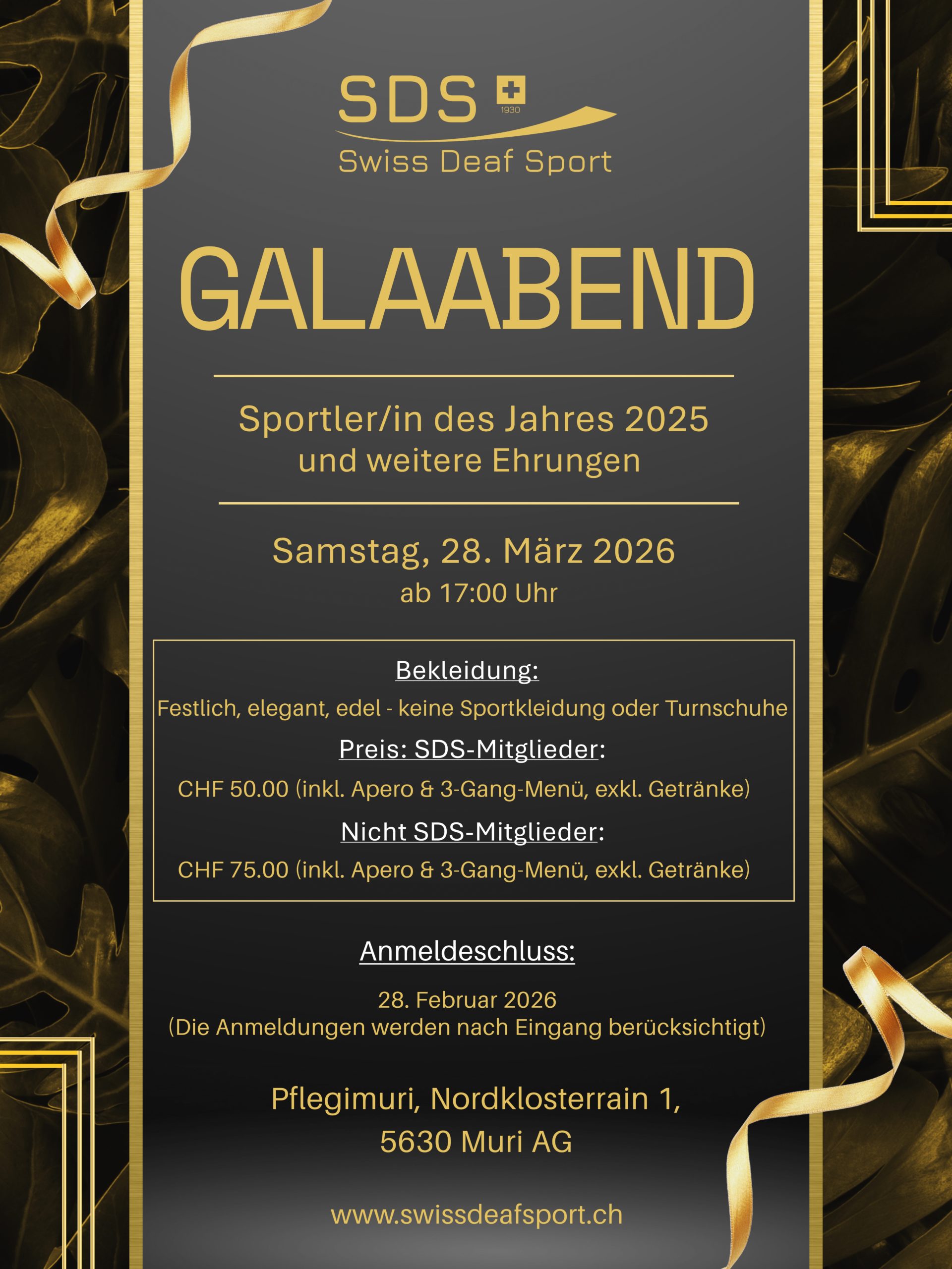 - SDS-Mitglied: CHF 50.– (Apéro und 3-Gang-Menü, Getränke exkl.)