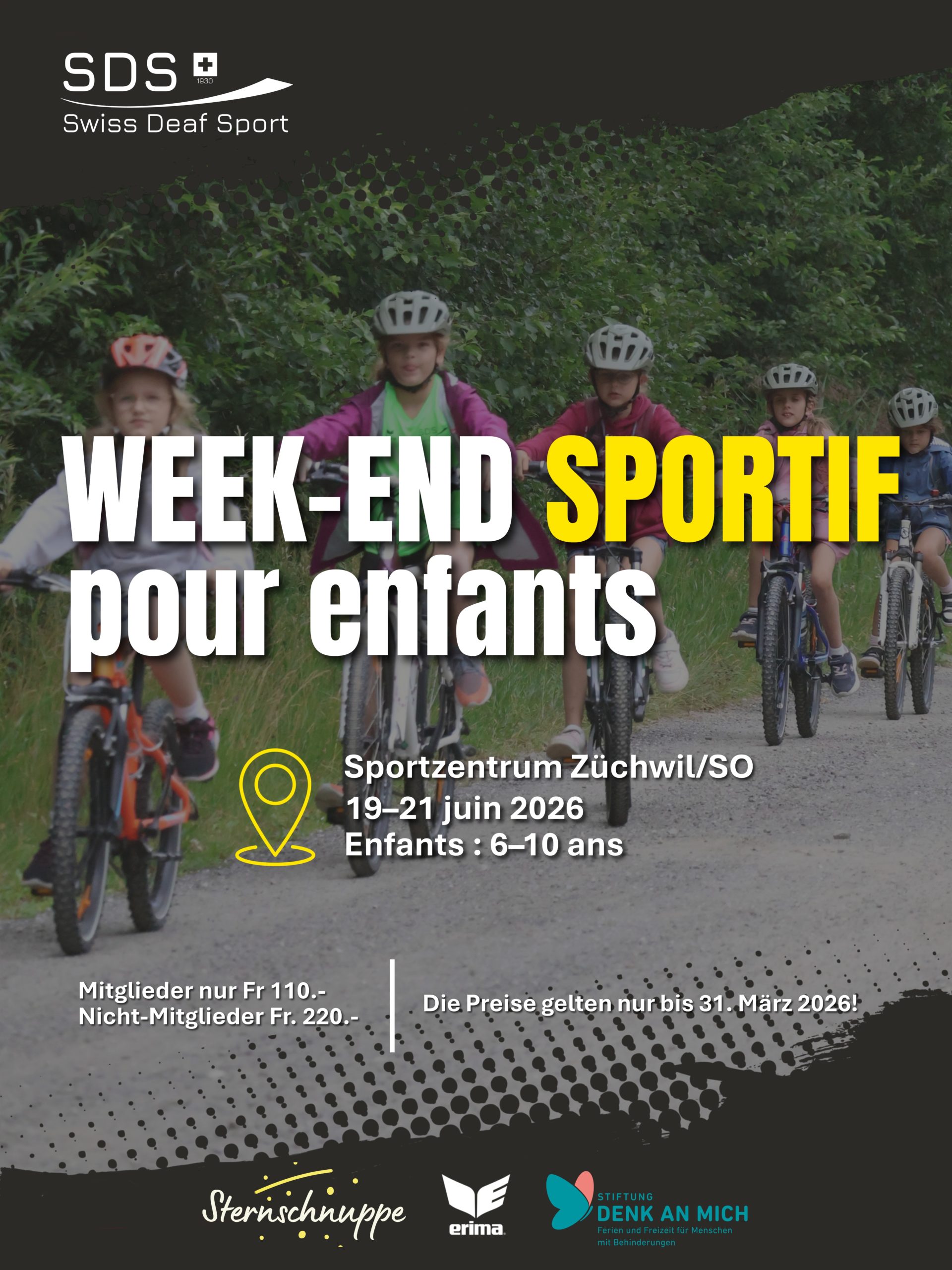 Participe au week-end sportif pour enfants sourds et malentendants de 6 à 10 ans, venus de toute la Suisse, organisé par Swiss Deaf Sport au centre sportif de Züchwil/SO. Les places sont limitées. Inscris-toi vite.