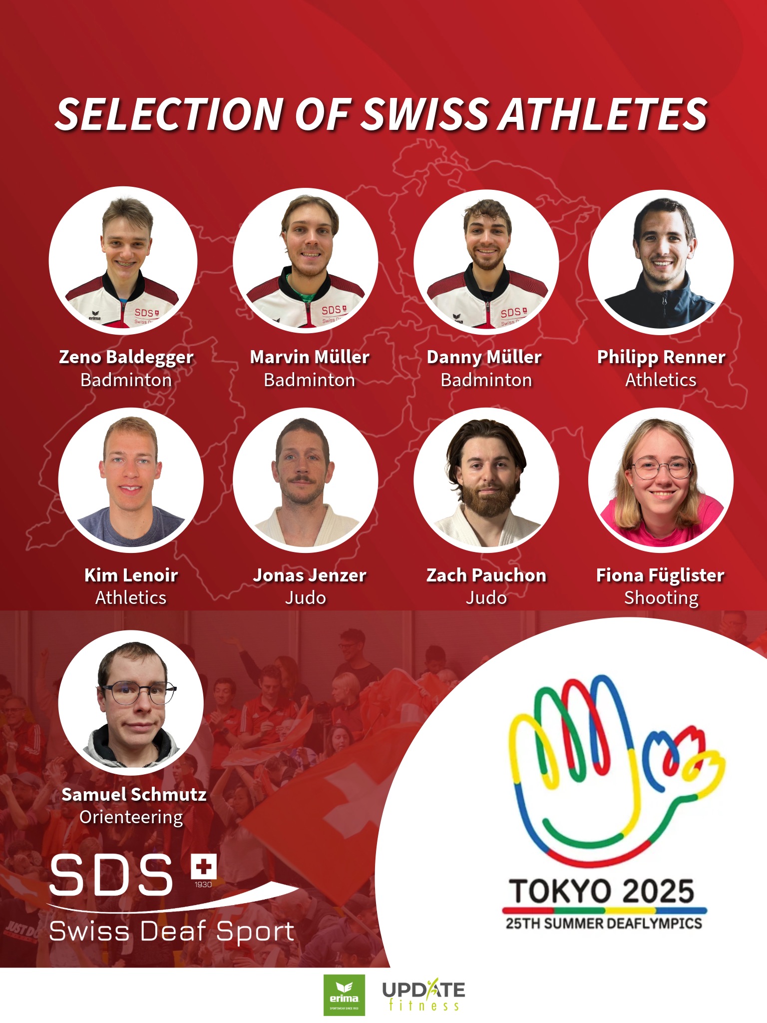Nove atlete e atleti. Cinque discipline. Un sogno. Le nostre sportive e i nostri sportivi svizzeri con disabilità uditiva partecipano a Tokyo.Il loro obiettivo è più di una medaglia: vogliono mostrare forza, resistenza e fiducia in sé stessi sul palcoscenico mondiale. Sostenete Team Svizzera: entrate a far parte del loro successo e aiutateli a scrivere la storia ai Deaflympics di Tokyo!