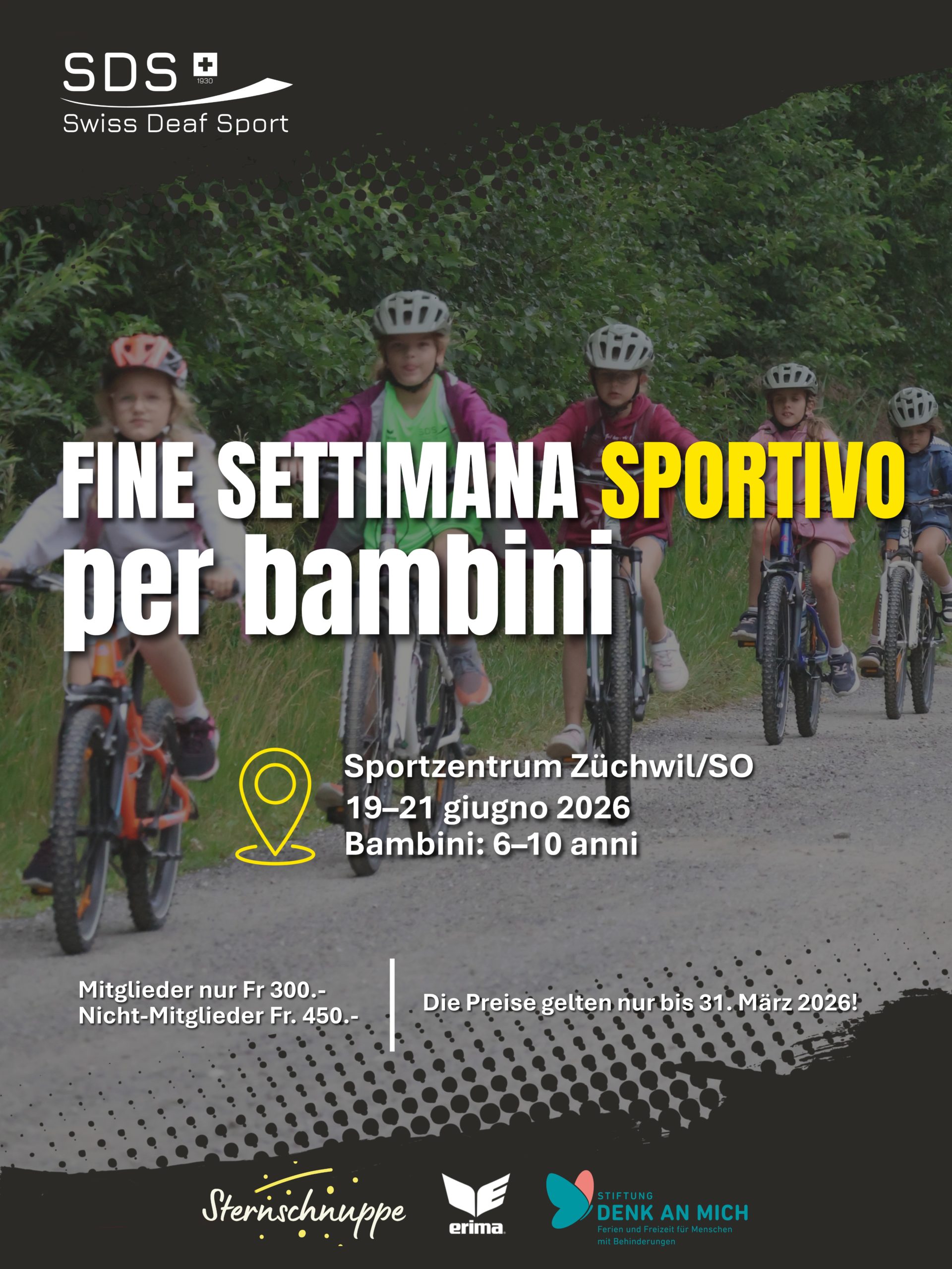 Partecipa al fine settimana sportivo per bambini sordi e ipoudenti dai 6 ai 10 anni, provenienti da tutta la Svizzera, organizzato da Swiss Deaf Sport presso il centro sportivo di Züchwil/SO. I posti sono limitati. Iscriviti subito.
